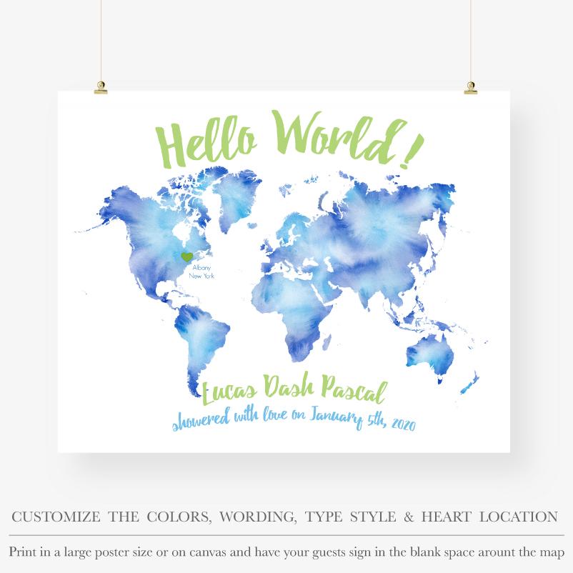 Printable Baby shower guest book alternative, watercolor or floral world map design, with marked location of your baby's birthplace. Available as digital JPG and PDF files. Print them as a large poster or on canvas and have your guests sign in the blank space around the map. The design can be customized for any event, such as weddings, birthdays, anniversary parties, and so on
